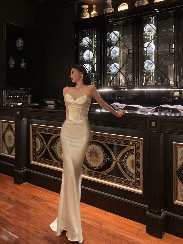 Sexy Mermaid Spaghetti Straps White Silk Satin Long Prom Dresses Birthday Outfits SD305