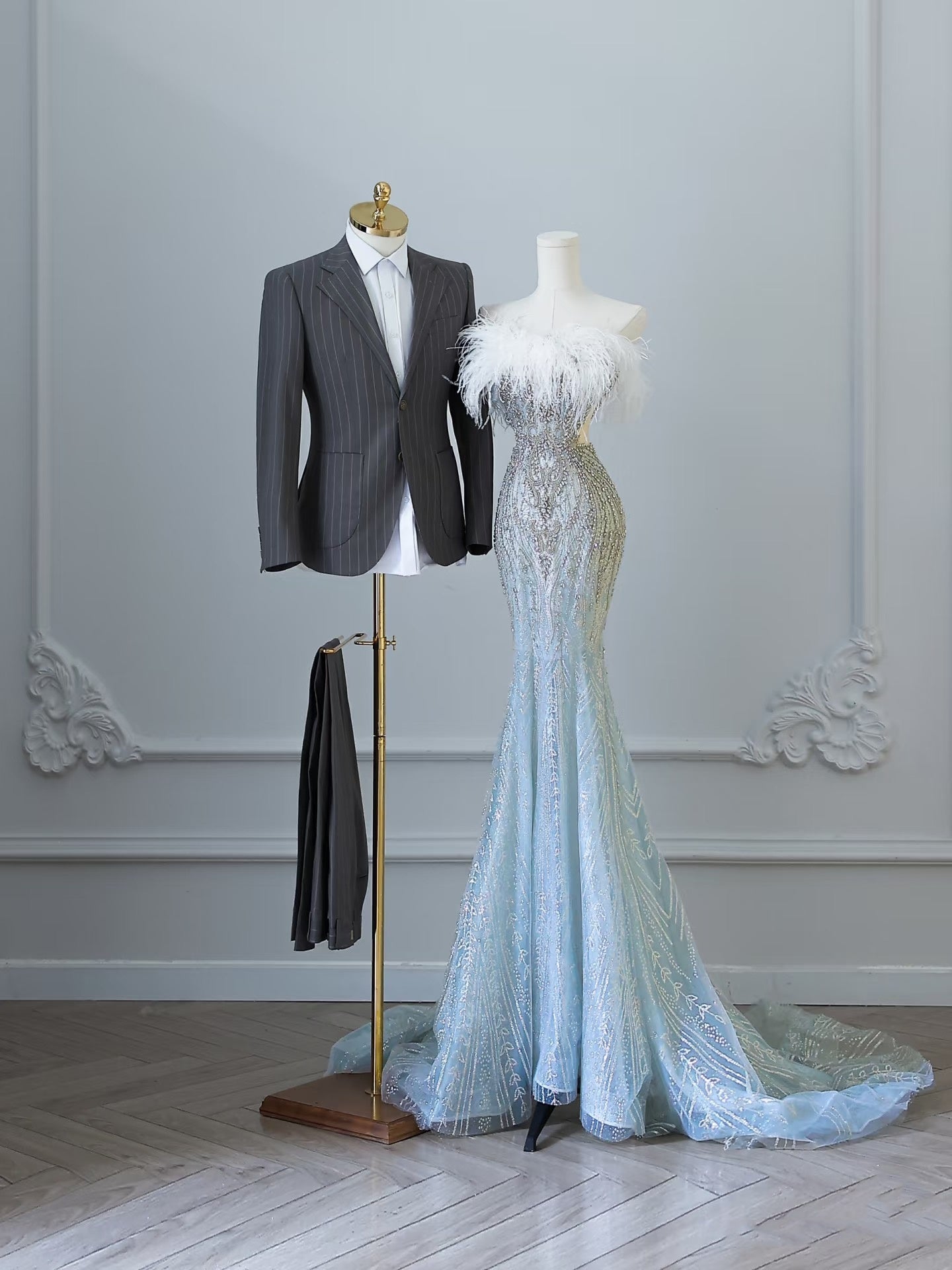 Sexy Mermaid Strapless Blue Sequin Long Prom Dresses Evening Gowns S3833