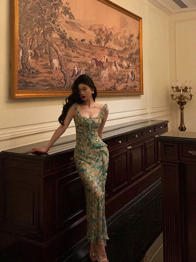Sexy Mermaid Straps Floral Green Chiffon Prom Dresses Birthday Outfits Evening Gown SD943