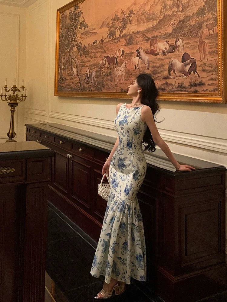 Sexy Sheath Boat Sleeveless Blue Floral Ruffle Long Prom Dresses Birthday Outfits SD616