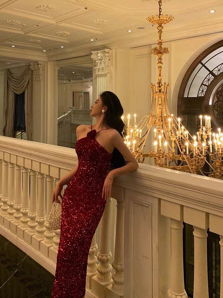 Sexy Sheath Halter Sleeveless Flower Sequin Date Night Dress Prom Dresses Birthday Outfits SD767