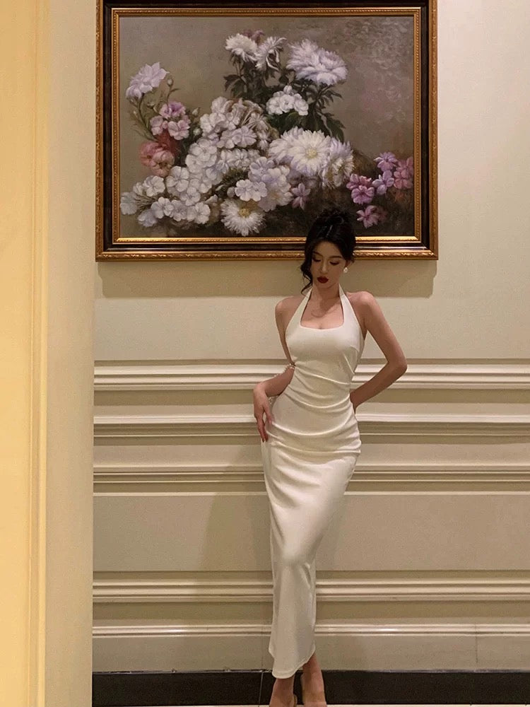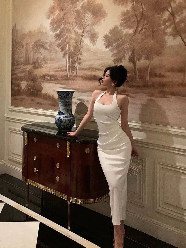 Sexy Sheath Halter Sleeveless White Tea Length Prom Dresses Birthday Outfits SD630