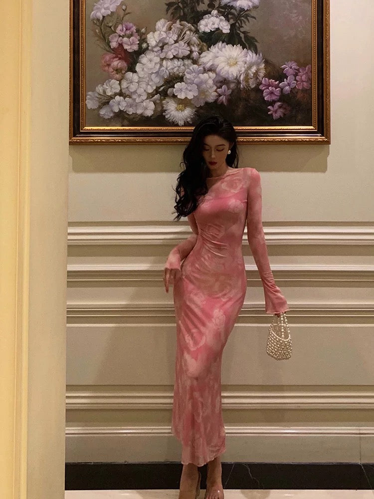 Sexy Sheath Pink Floral 2 Pieces Long Sleeves Prom Dresses Birthday Outfits SD309