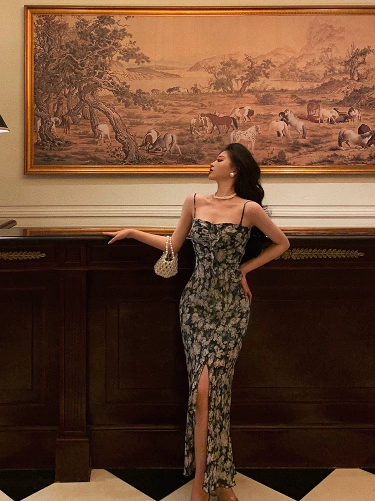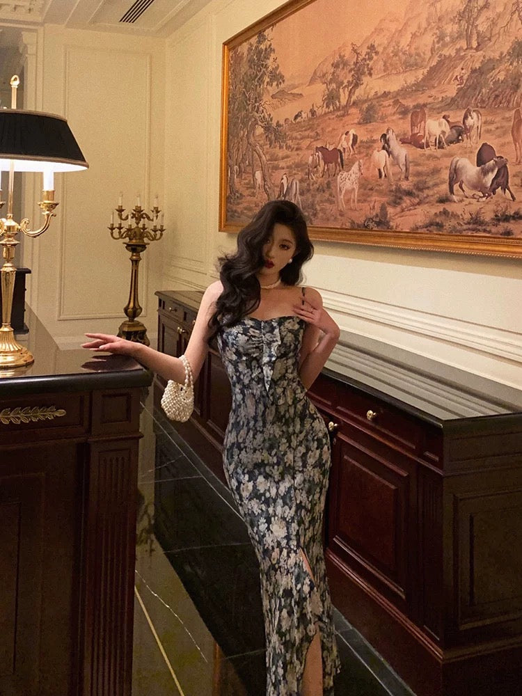Sexy Sheath Spaghetti Straps Blue Floral Prom Dresses Birthday Outfits Evening Gown SD956