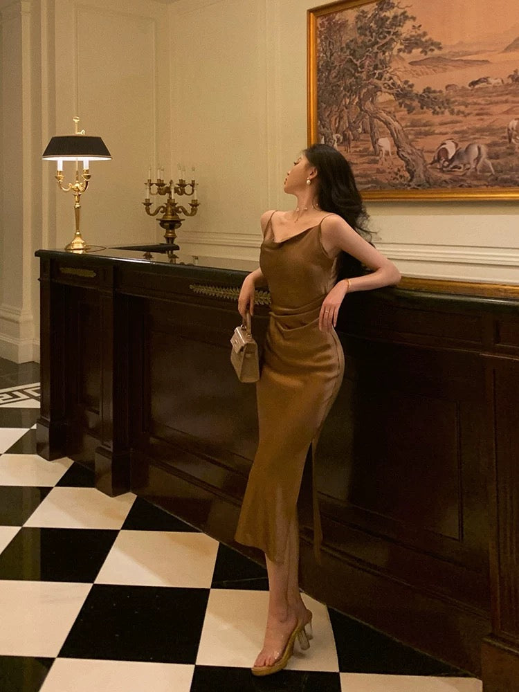 Sexy Sheath Spaghetti Straps Brown Satin Tea Length Slit Prom Dresses Birthday Outfit SD776
