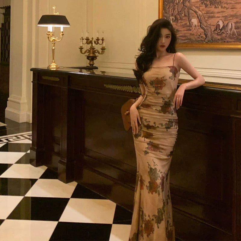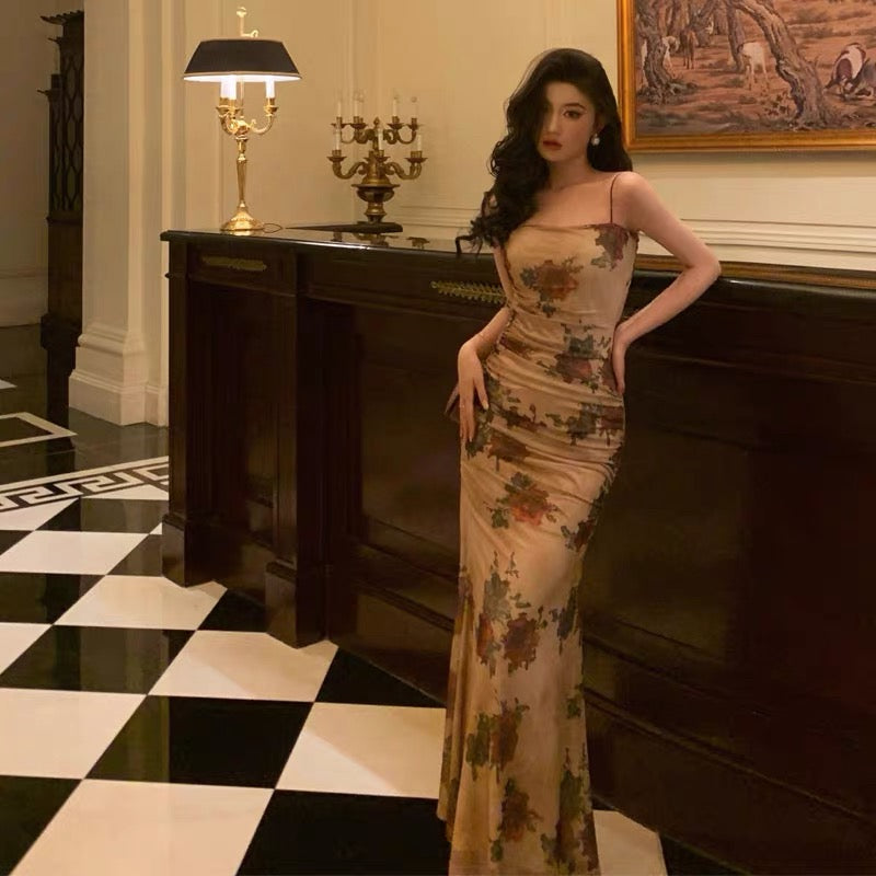 Sexy Sheath Spaghetti Straps Champagne Floral Prom Dresses Birthday Outfits Evening Gown SD922