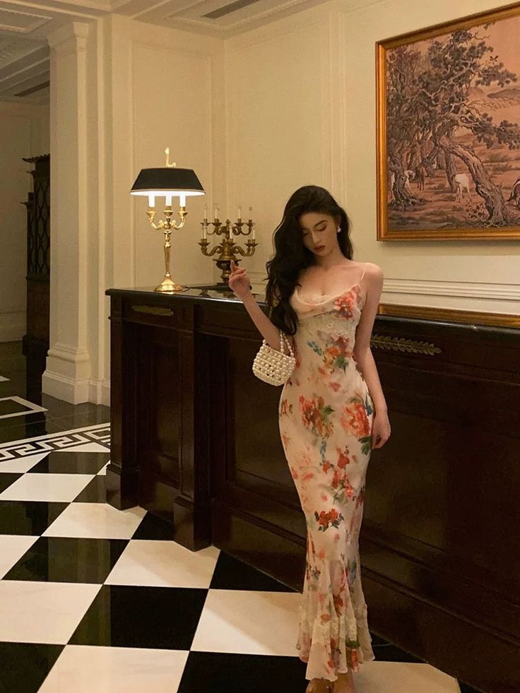Sexy Sheath Spaghetti Straps Floral Ankle Length Prom Dresses Birthday Dress fg7029