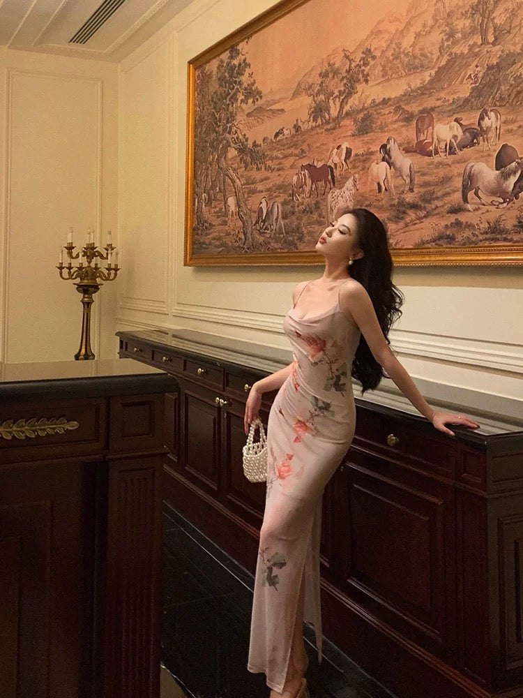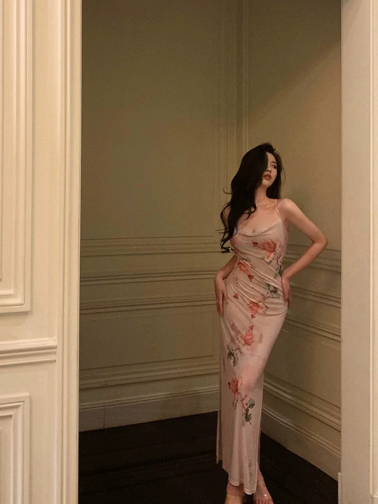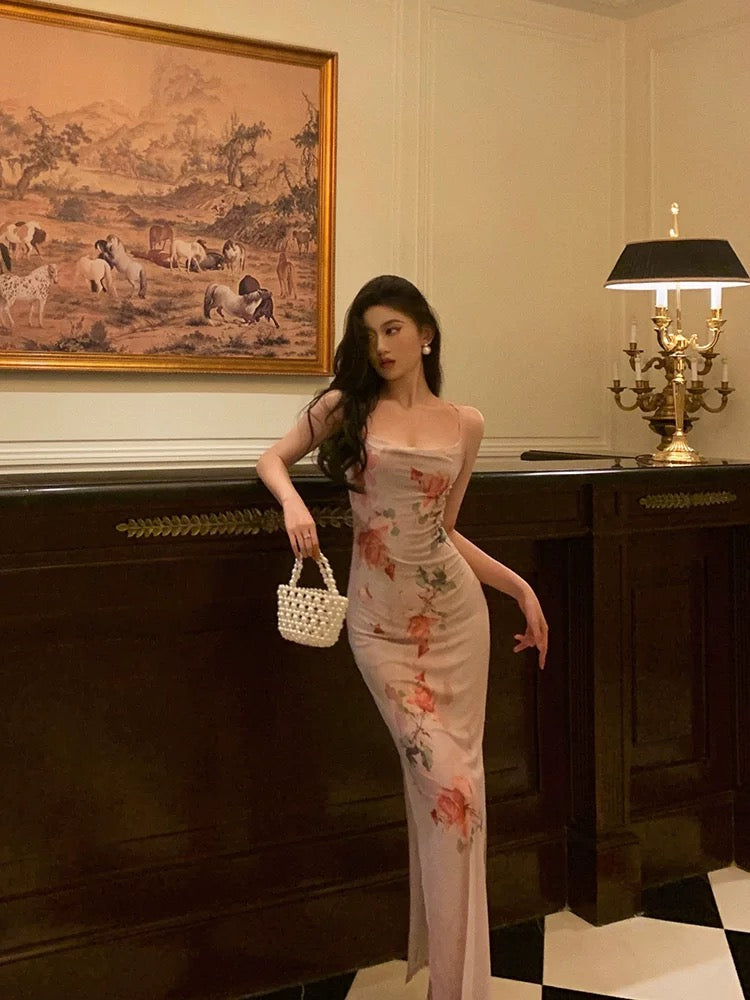 Sexy Sheath Spaghetti Straps Floral Pink Ankle Length Prom Dresses Birthday Outfits SD597