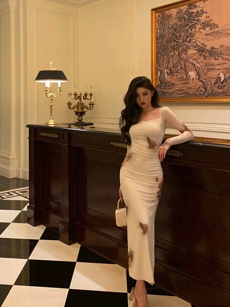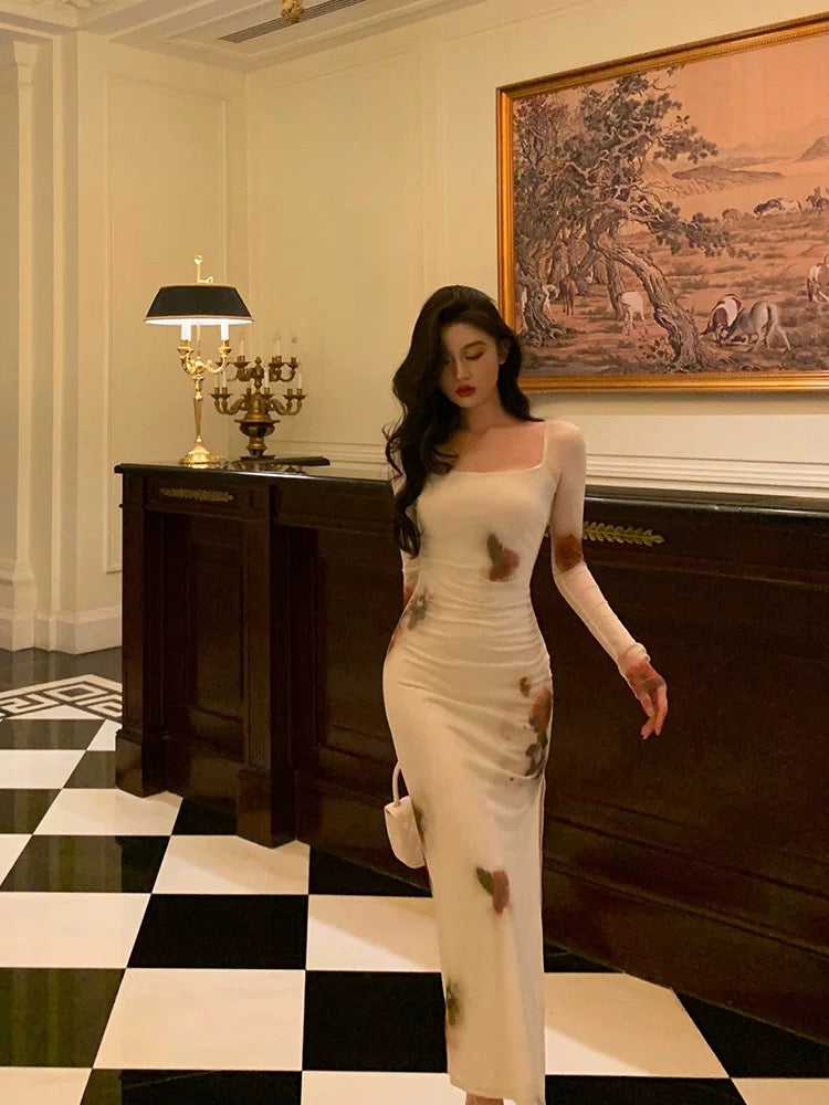 Sexy Sheath Square Neckline Long Sleeves Slit Floral Prom Dresses Birthday Dress SD411