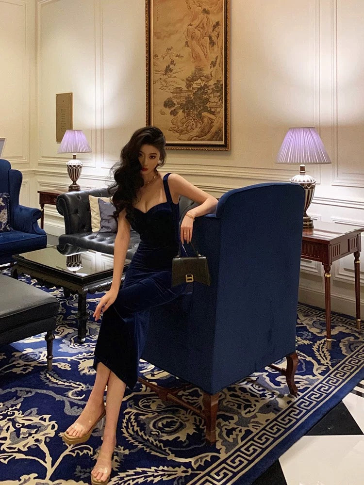 Sexy Sheath Straps Royal Blue Velvet Ankle Length Prom Dresses Birthday Outfits SD599
