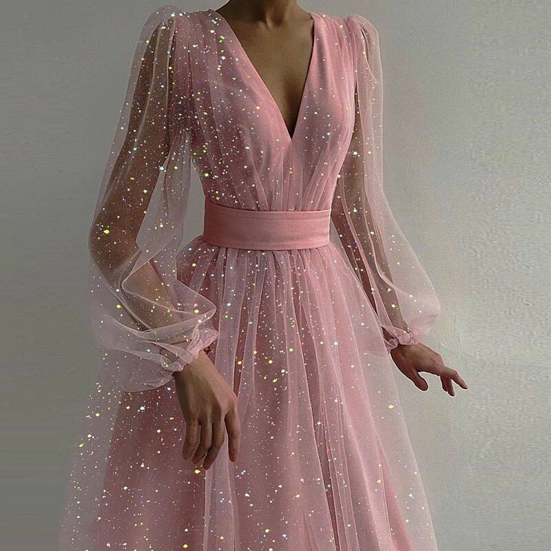 loveedsTM-Sexy Women Lantern Sleeve V Neck Solid Maxi Dress Elegant Autumn Ladies Gauze Party Dress Fashion Femme Princess Dress Vestidos