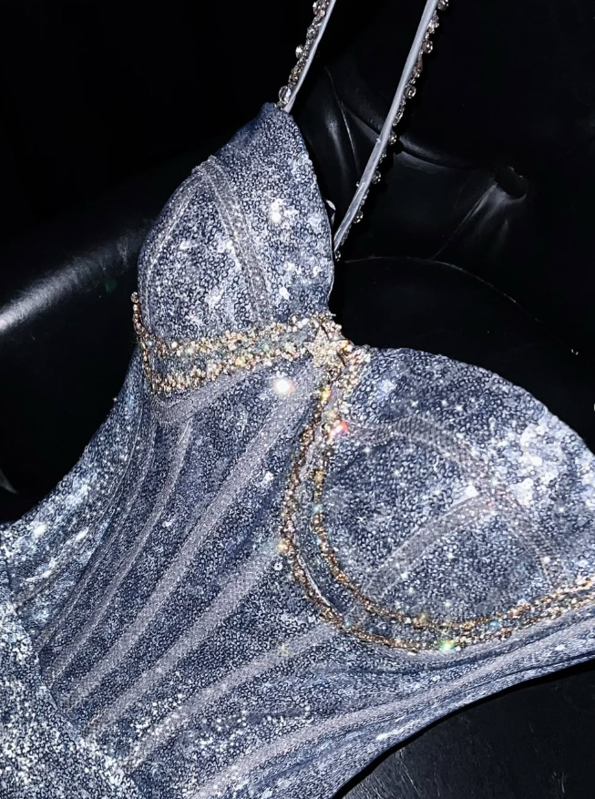Shiny A Line Spaghetti Strap Rhinestone Silver Sequin Long Prom Dress Graduation Prom Dress SH2488