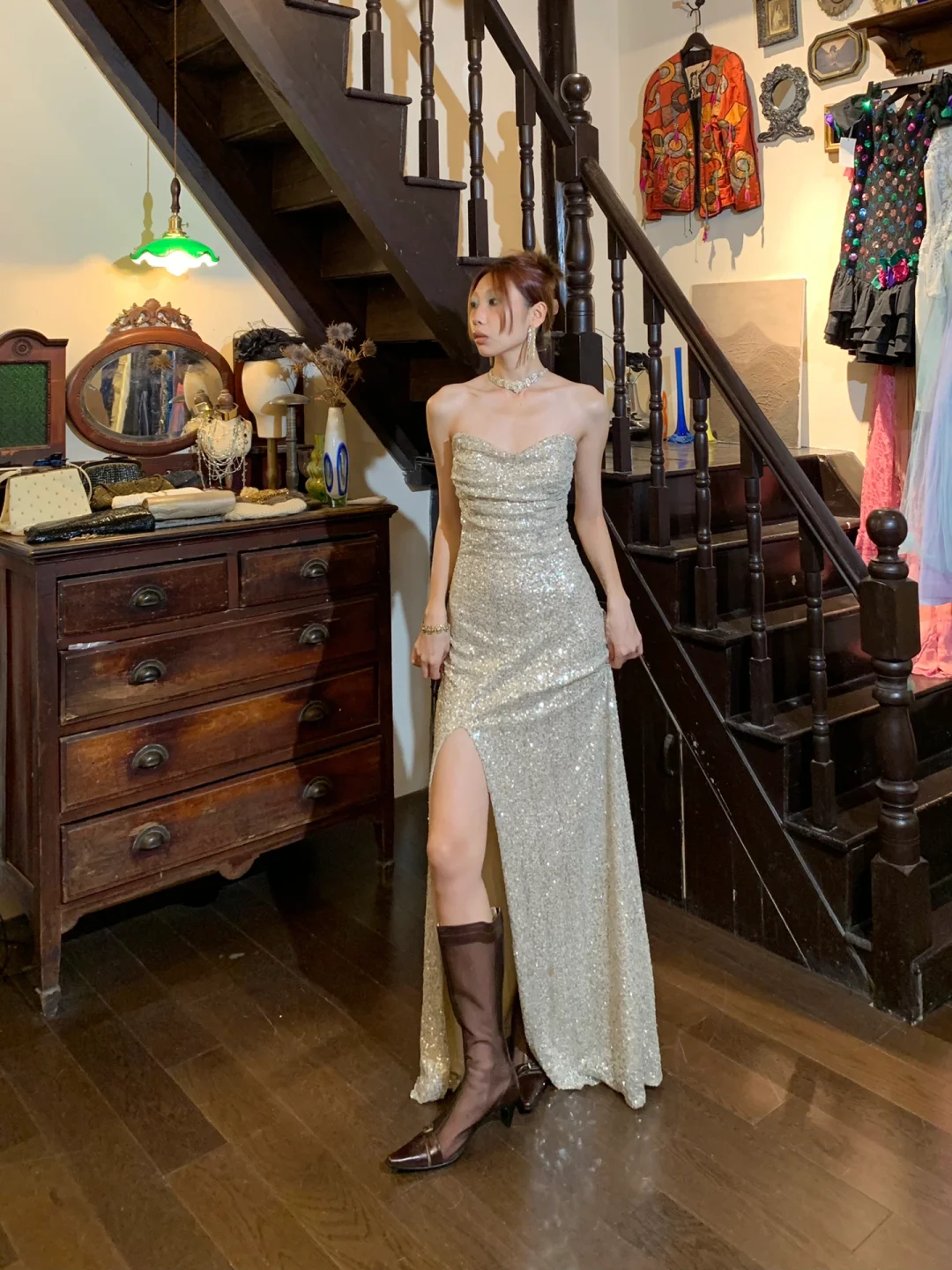 Shiny A Line Sweetheart Neck Silver Sequin Prom Dress Evening Dress with Slit SH3084