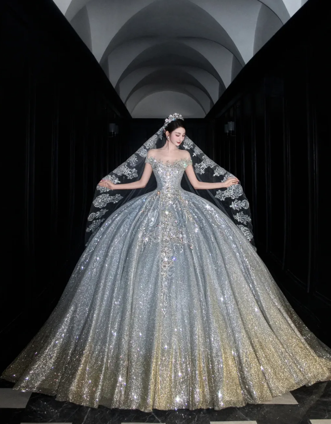 Shiny Rhinestone Beaded Silver Sequin Ball V Neck Prom Dress Evening Dress Party Dress SH3613