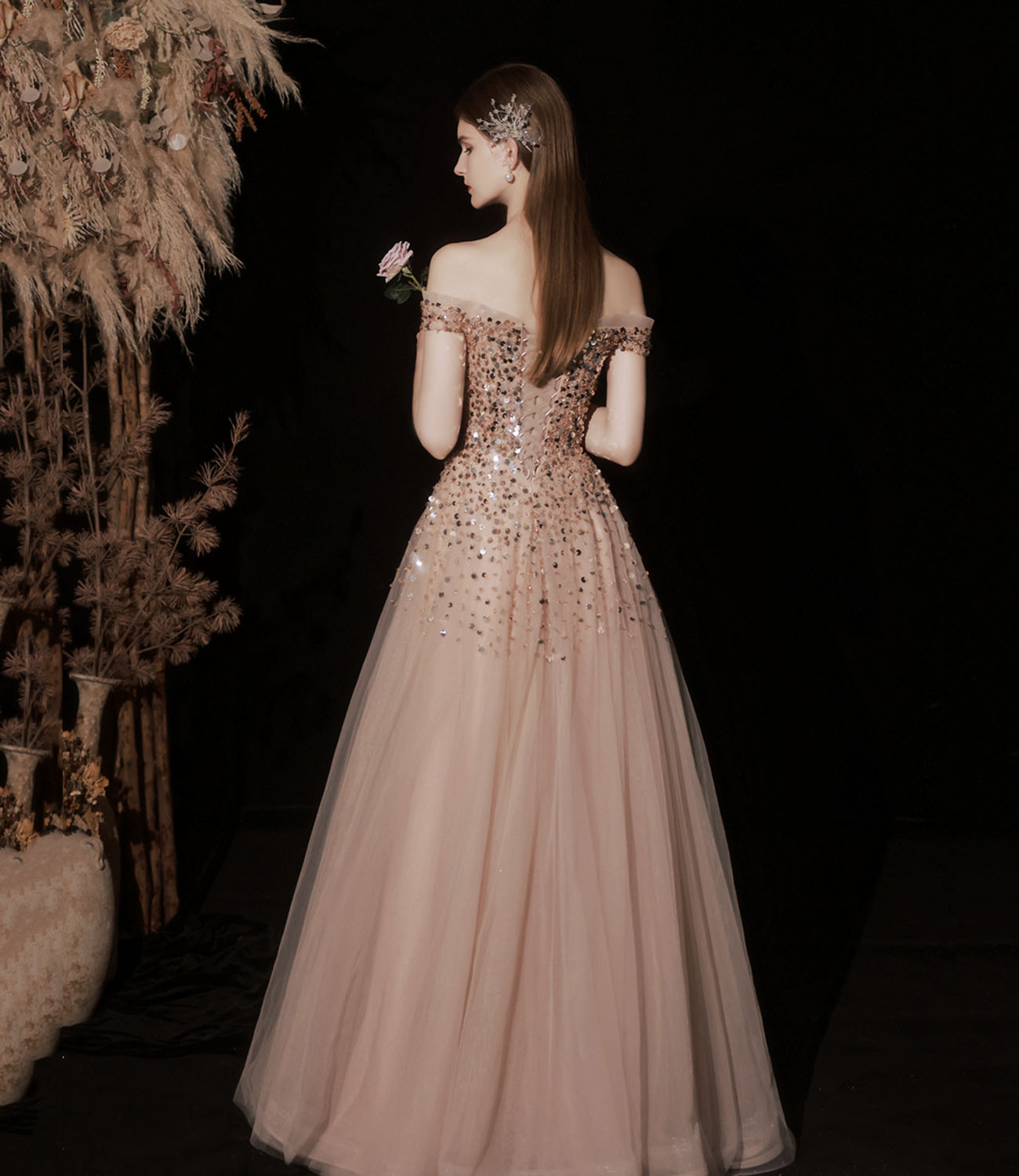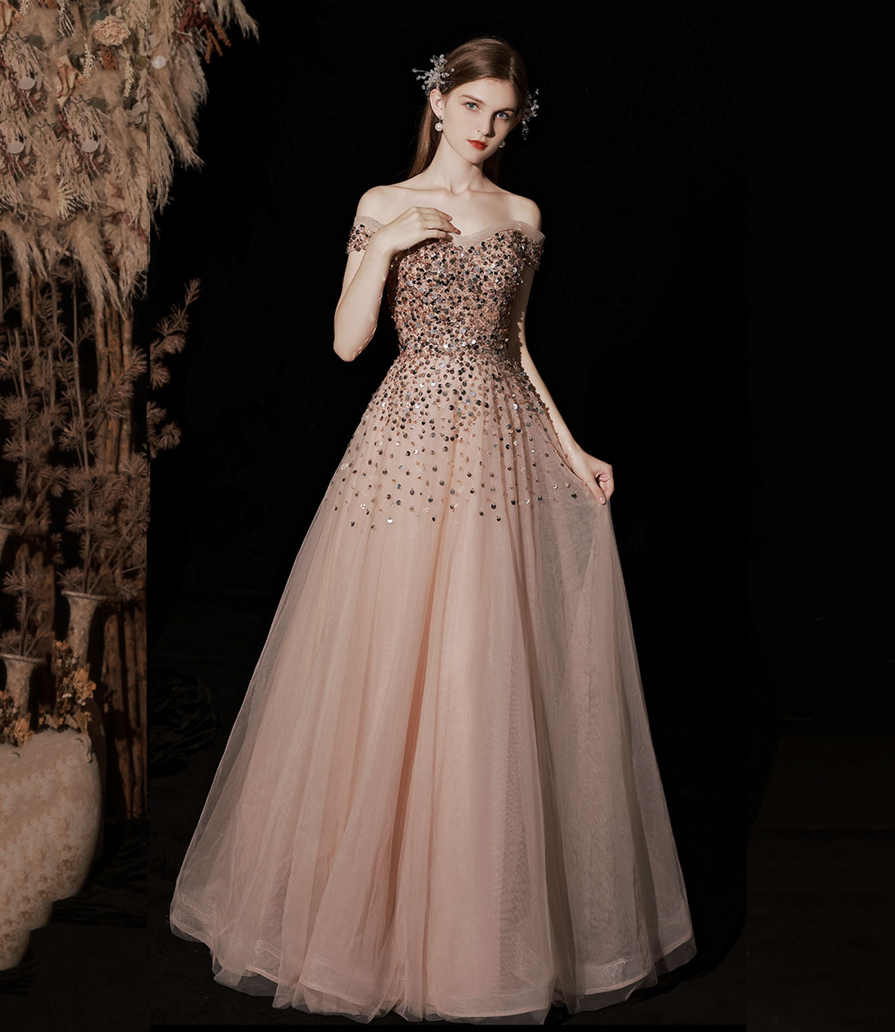 Shiny tulle sequins long prom dress A line evening gown