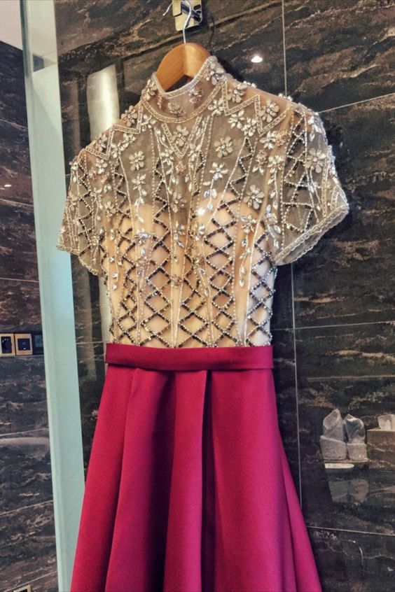 short sleeves red long formal dress with beaded bodice prom gown cg16848