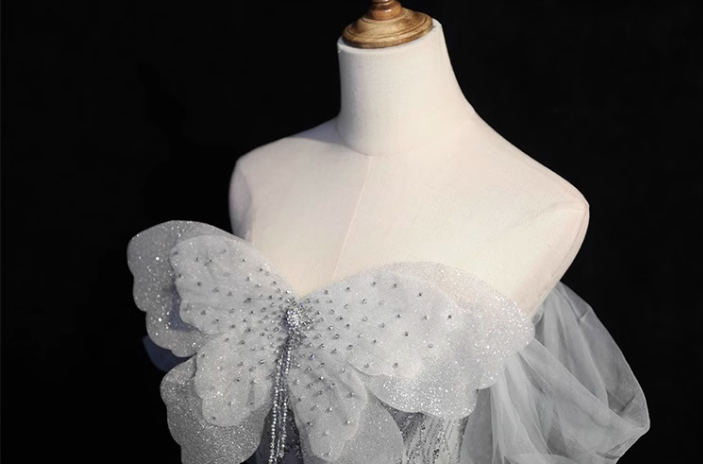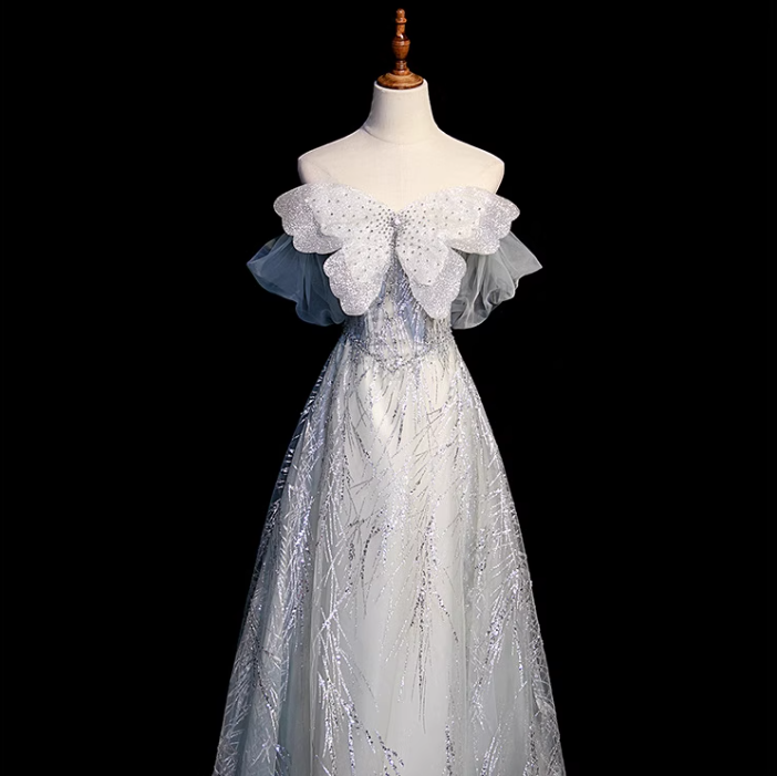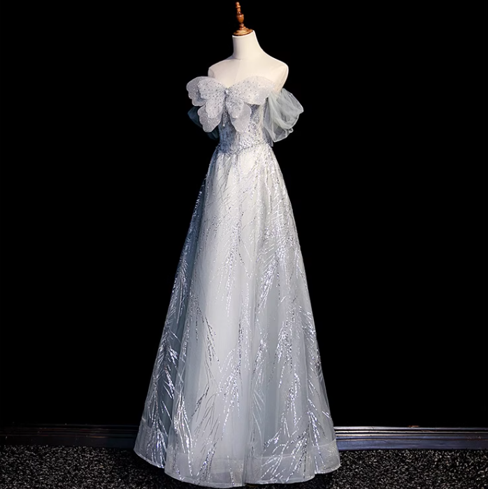 Silver Grey A-Line Tulle Sequin Long Prom Dress,Sweet Off-shoulder Evening Dress ED01473