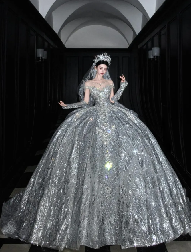 Silver Sequin Ball Gown Round Neck Prom Dress Evening Dress Party Dress SH3614