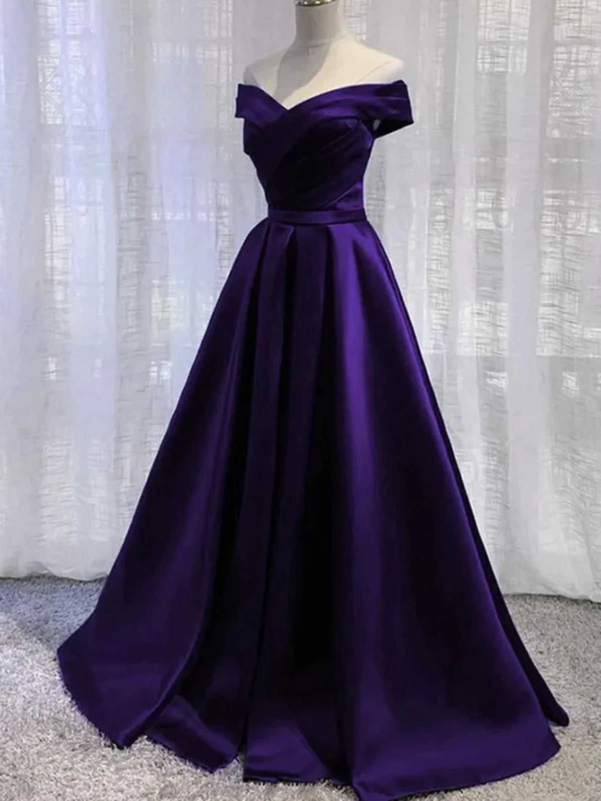 Simple A line Off the Shoulder Purple Satin Long Prom Dresses P2236
