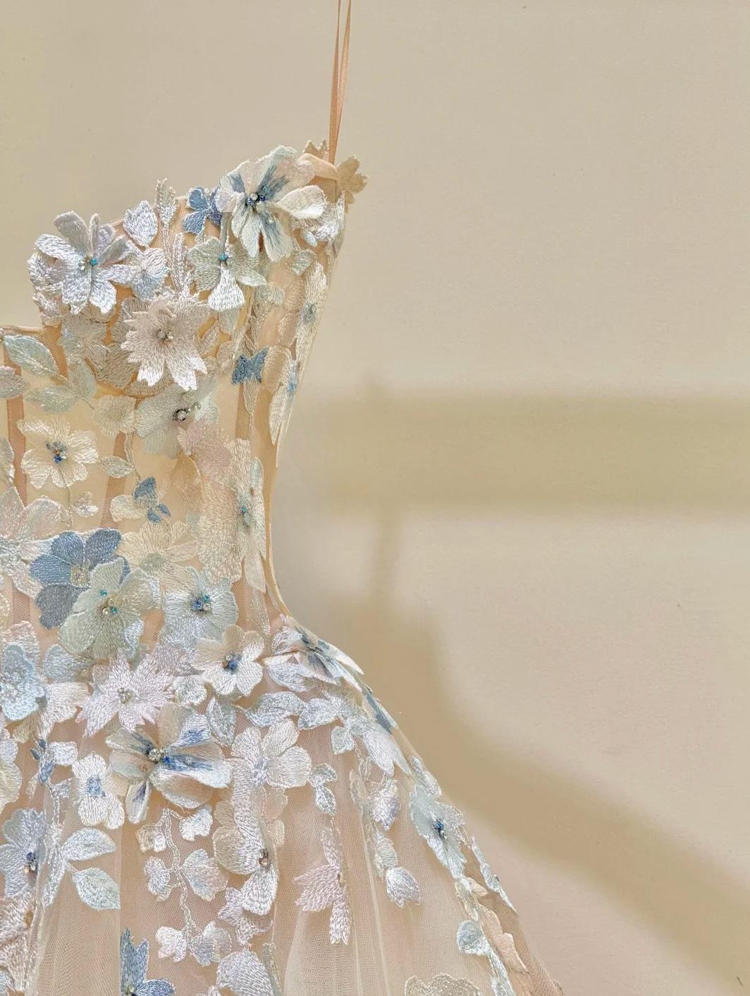 Simple Champagne A-Line Spaghetti Straps Tulle Applique Long Prom Dress Sweet Wedding Dress ED01718