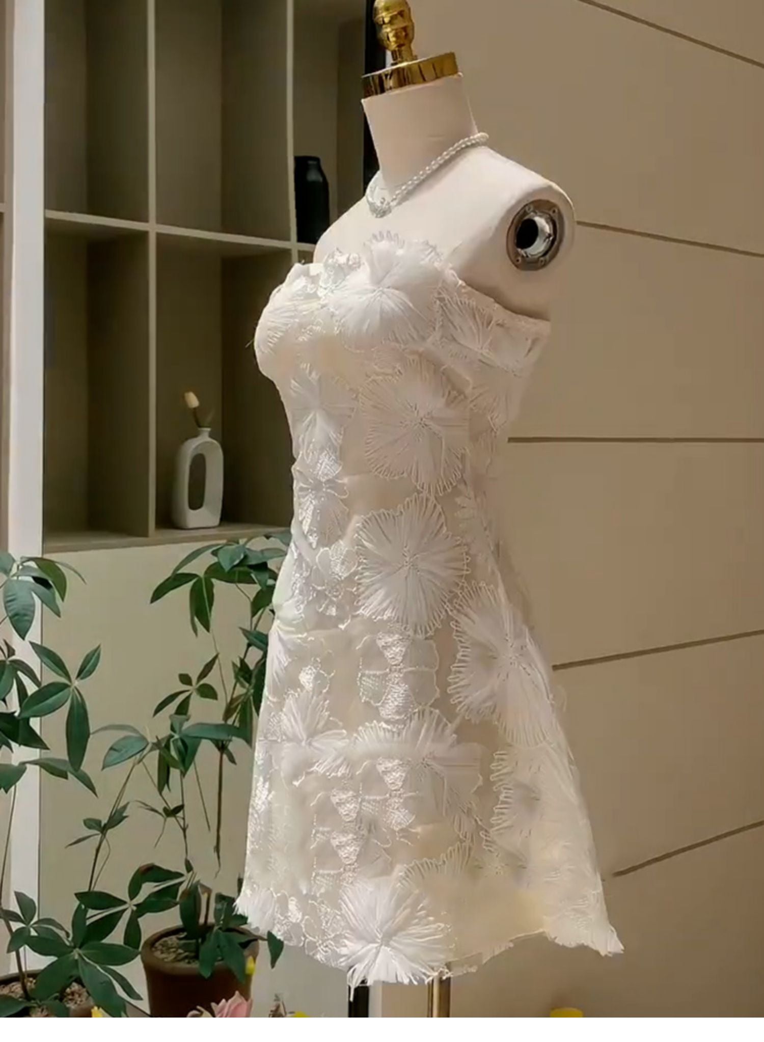 Simple A line Strapless White Short Lace Homecoming Dress Summer Hoco Dresses Cocktail Dress DP1751
