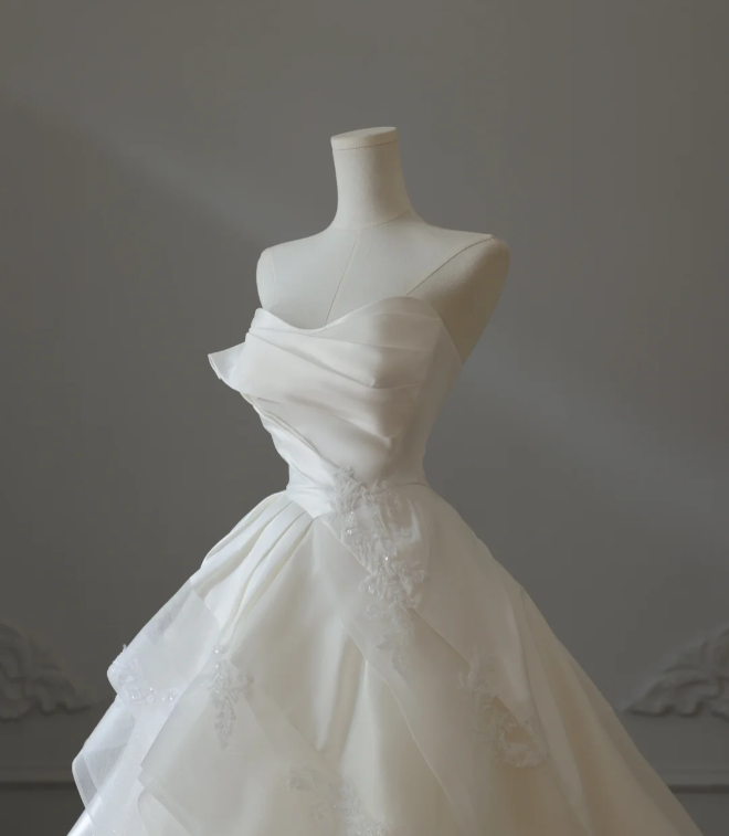 Simple and gentle tube top tulle A-line wedding dress with train P2559