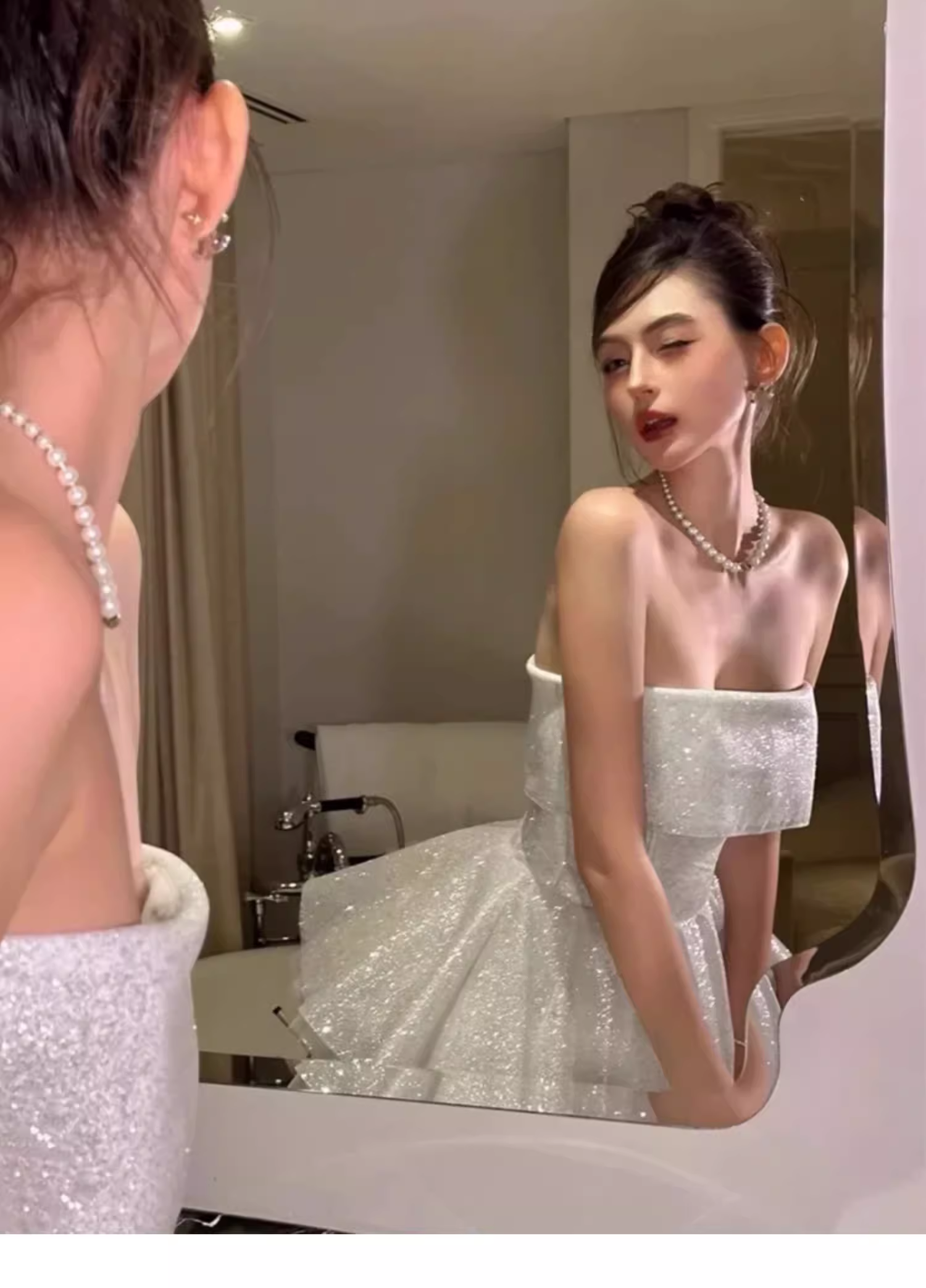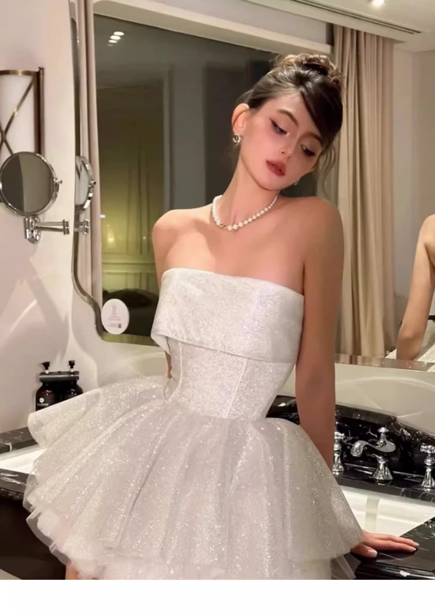 Simple Ball Gown Strapless White Sequin Homecoming Dress Summer Hoco Dresses Mini Cocktail Dress DH614