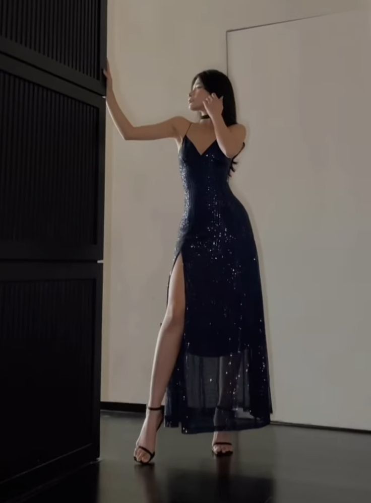 Simple Sheath Spaghetti Straps Sleeveless Navy Blue Sequin Slit Prom Dresses Formal Summer Wedding Guest Dresses Wedding Guest Outfits DP2205