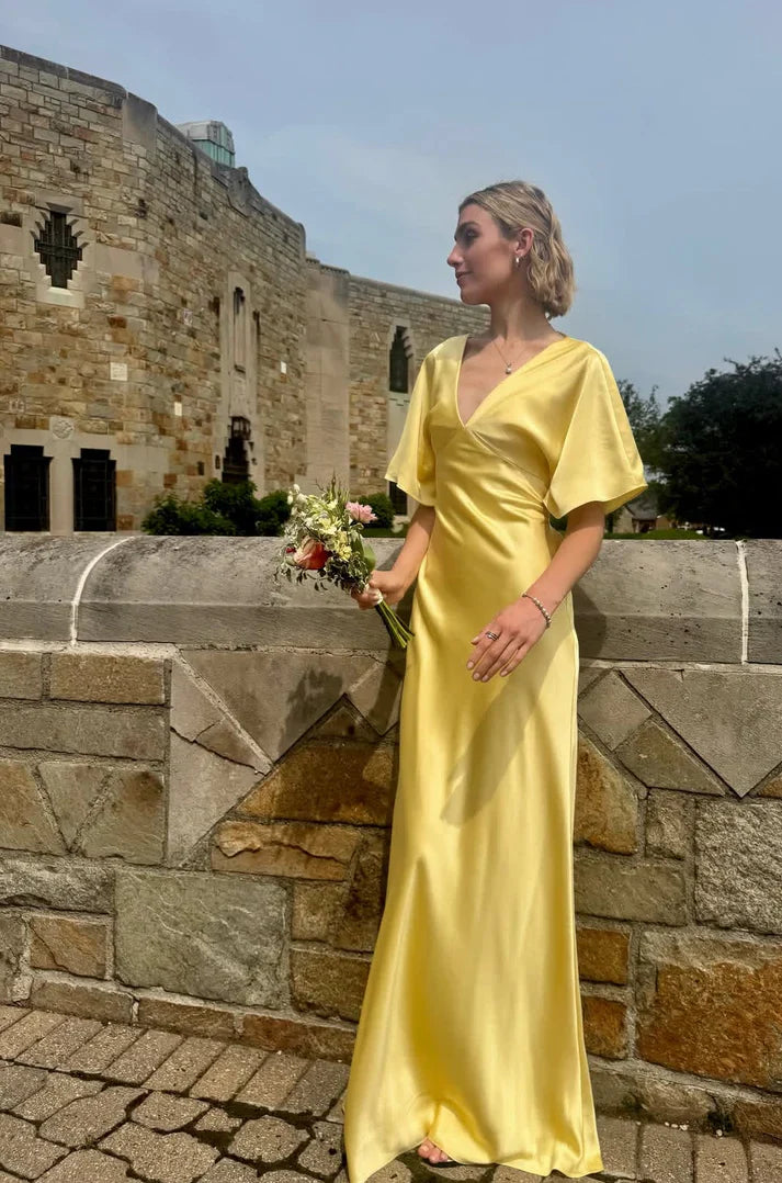 Simple Yellow A Line V Neck Sleeve Satin Long Prom Dress Evening Dress SH3730