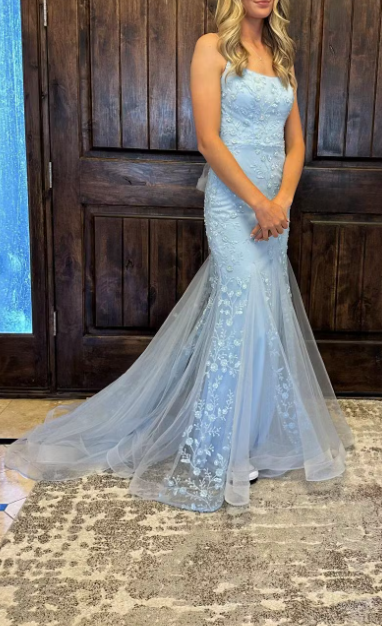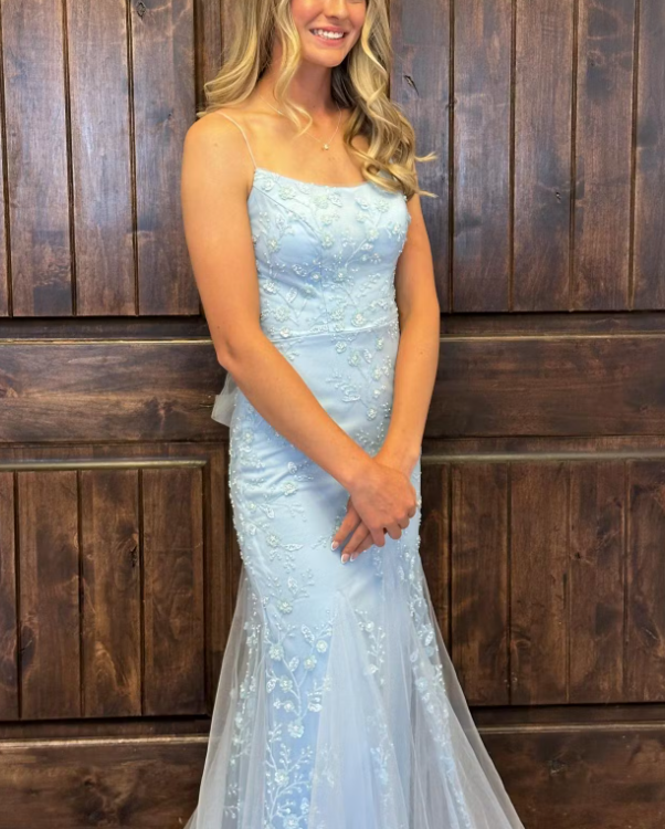 Spaghetti Straps Mermiad Blue Beaded Tulle Sequin Prom Dress with Appliques ED01310