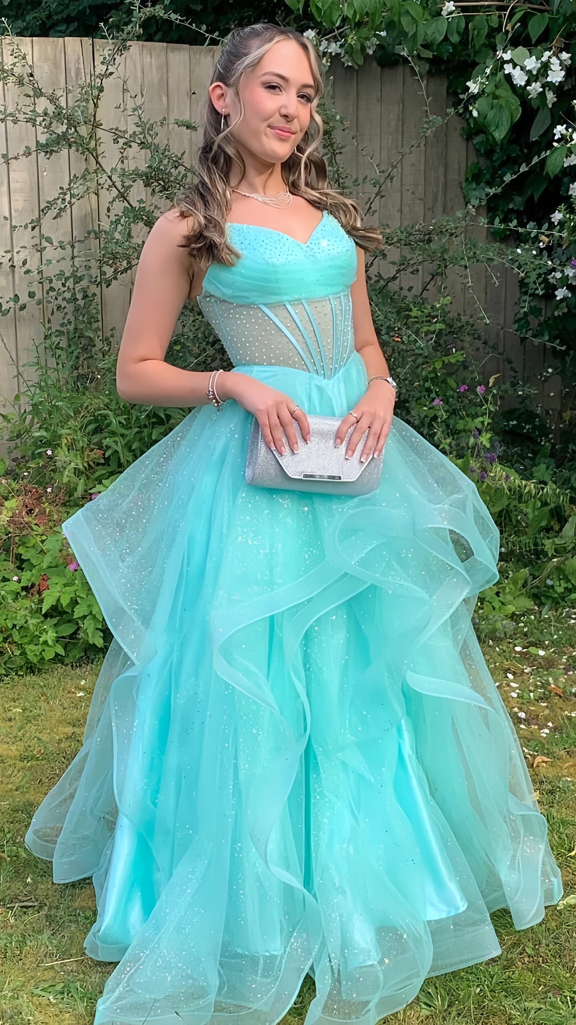 Sparkle Tiffany Blue Tulle Prom Dress, Sleeveless Ruffle Ball Gown