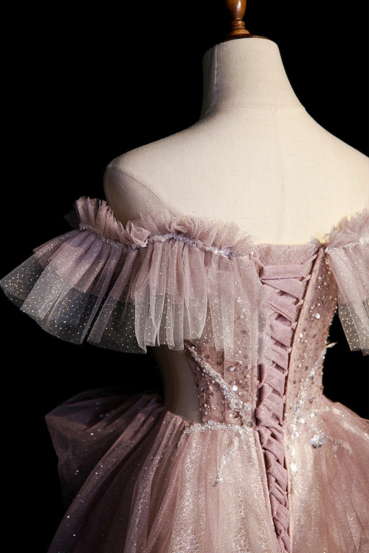 Pink Sequins Long A-Line Prom Dress, Off the Shoulder Evening Party Dress