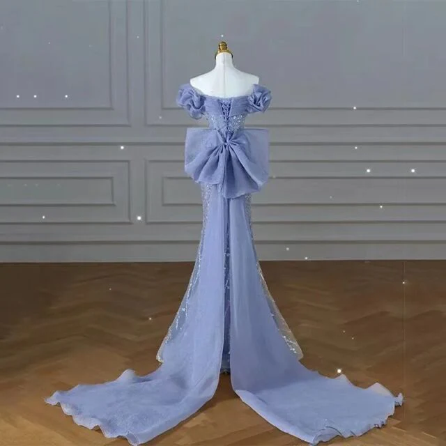 Sparkly Blue Prom Dress With Bow Sequins Off The Shoulder Mermaid Evening Gown SH1332