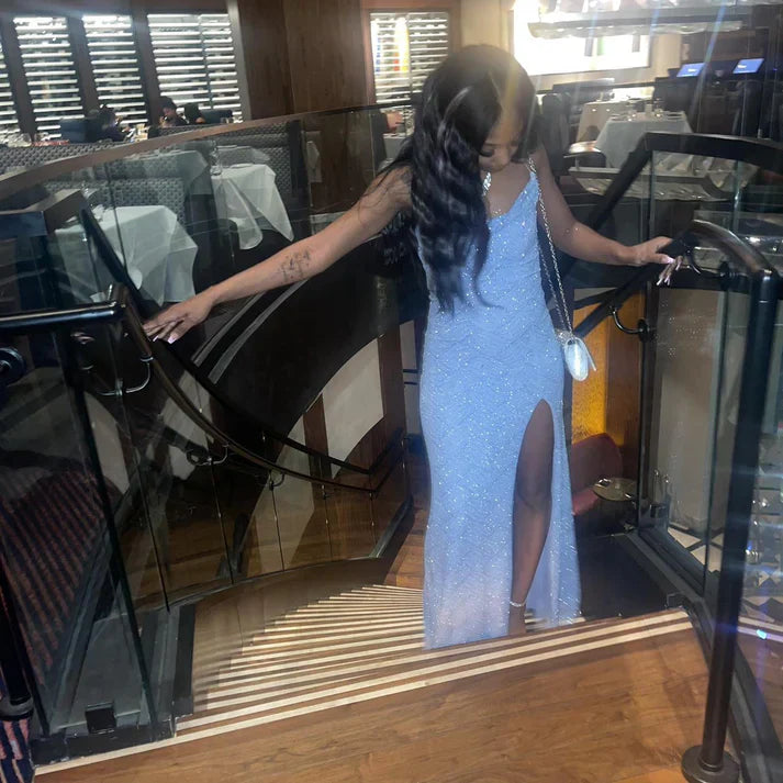 Sparkly Blue Sequins Sheath Evening Party Dress with High Slit Long Prom Dress Formal Dress DP288