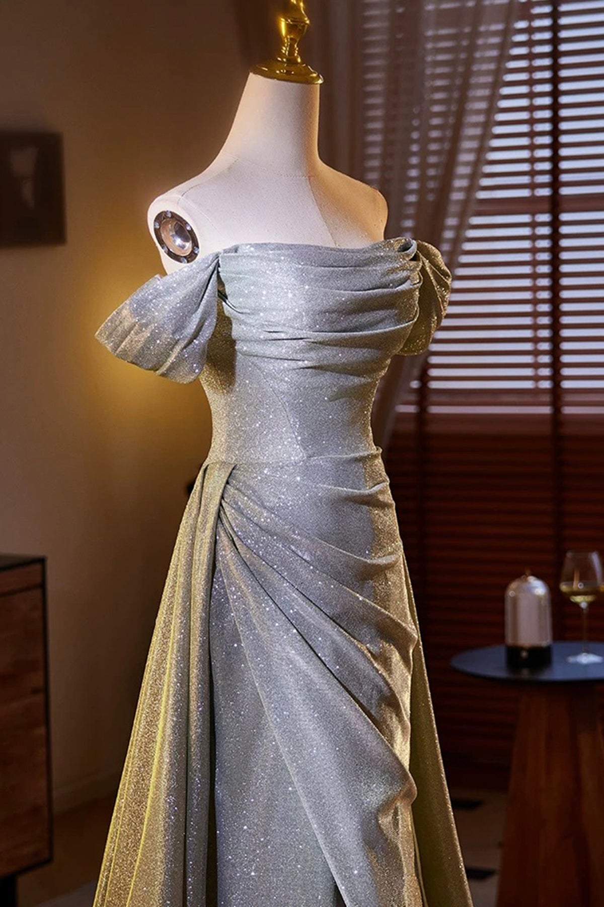 Sparkly Gray Sequins Split Front Prom Dress, Off the Shoulder Sweep Train Formal Dress