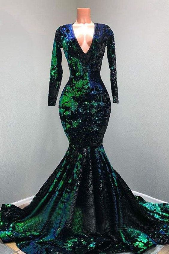 Sparkly Sequin Long Sleeve V-neck Mermaid Prom Dresses cg18922