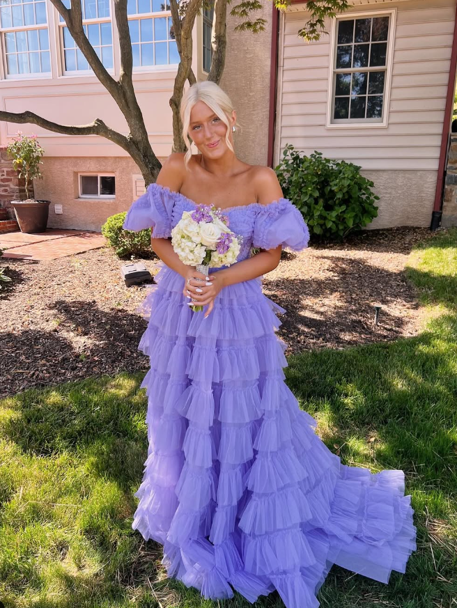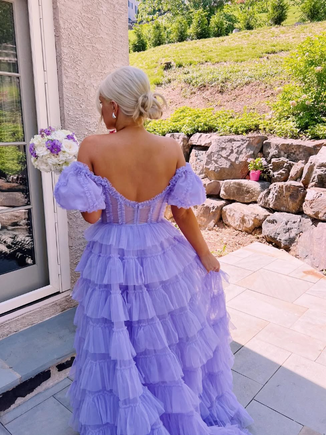 Stunning A Line Off the Shoulder Corset Tiered Purple Tulle Prom Dress Evening Dress SH2319