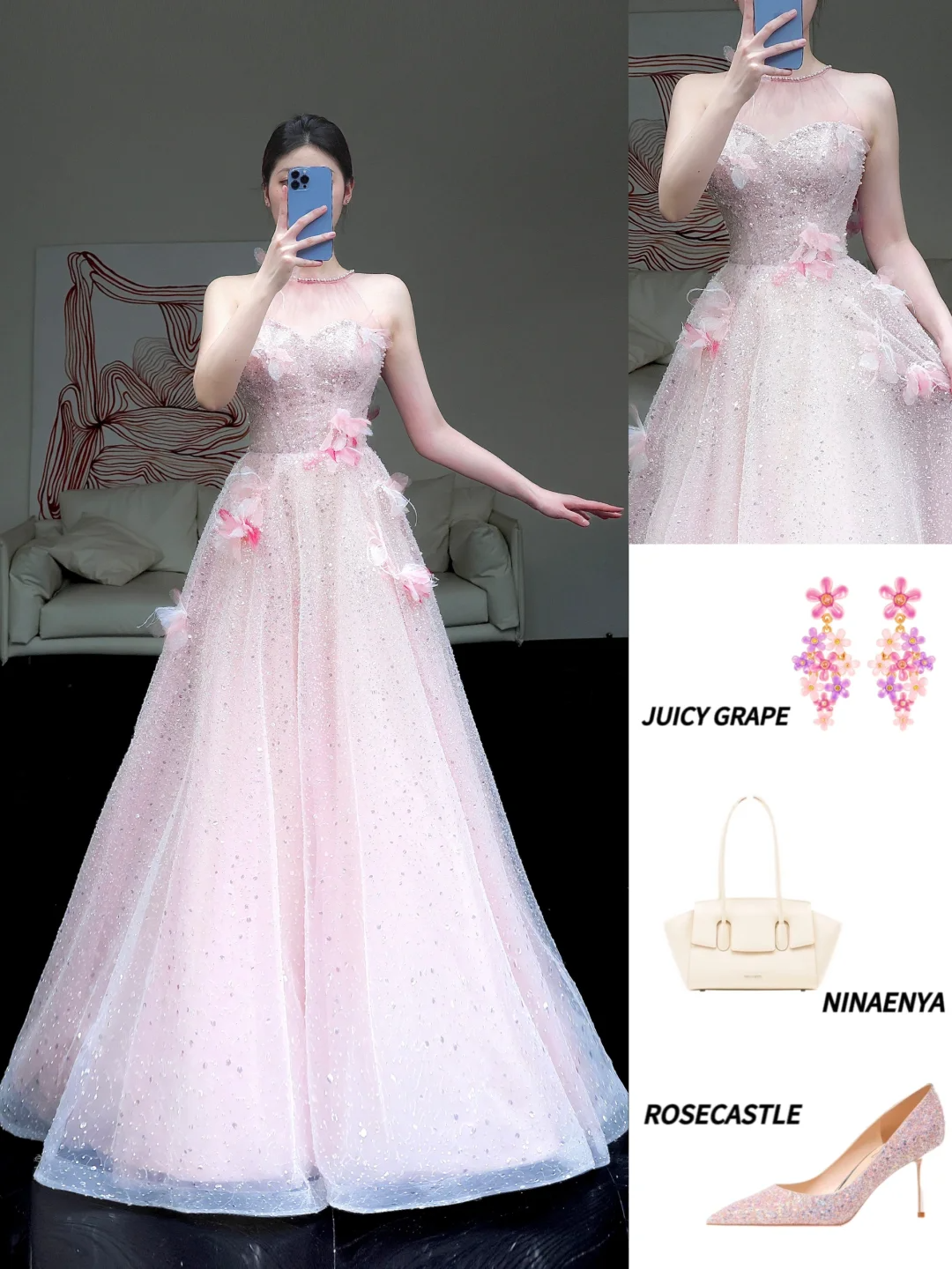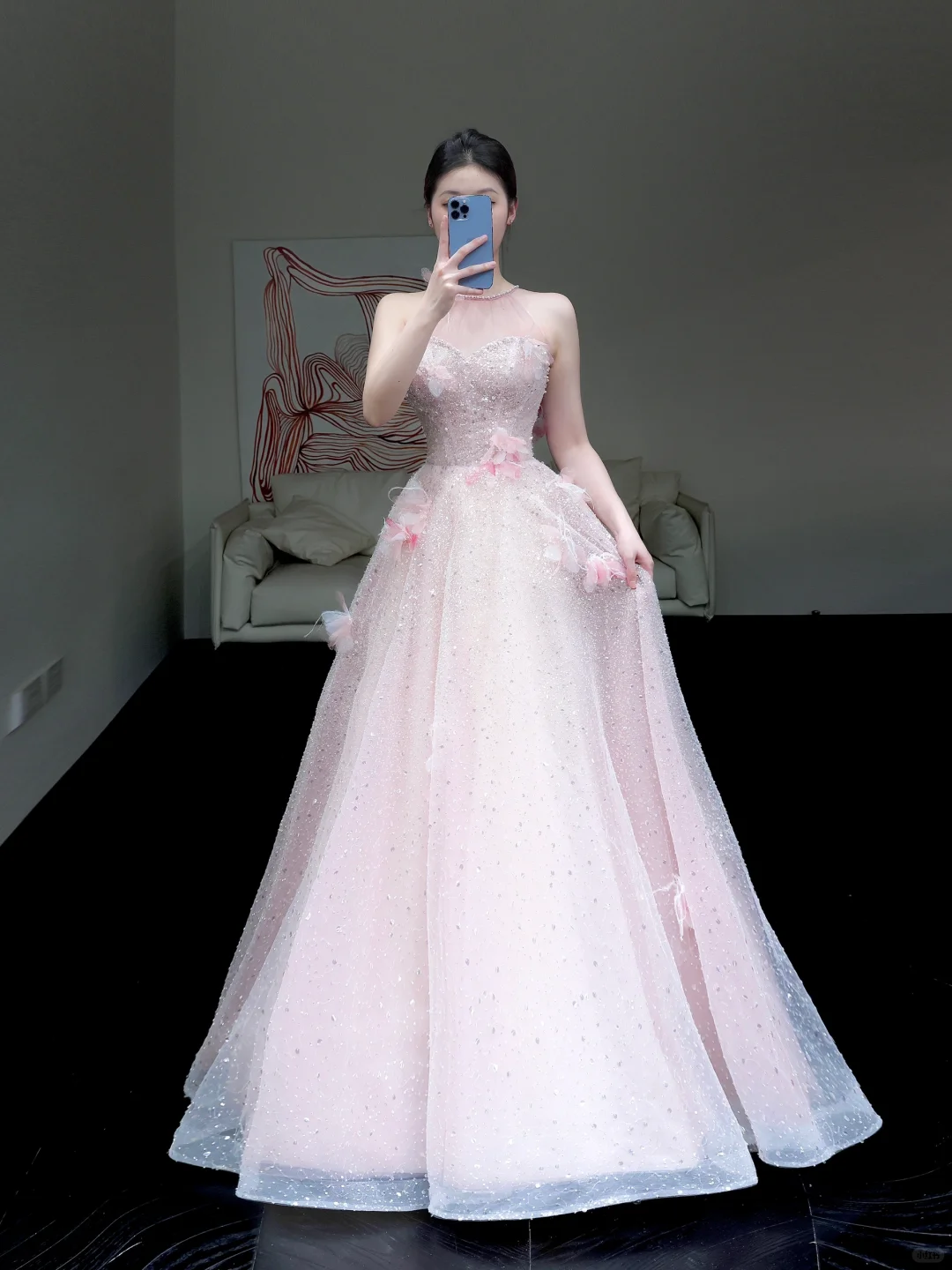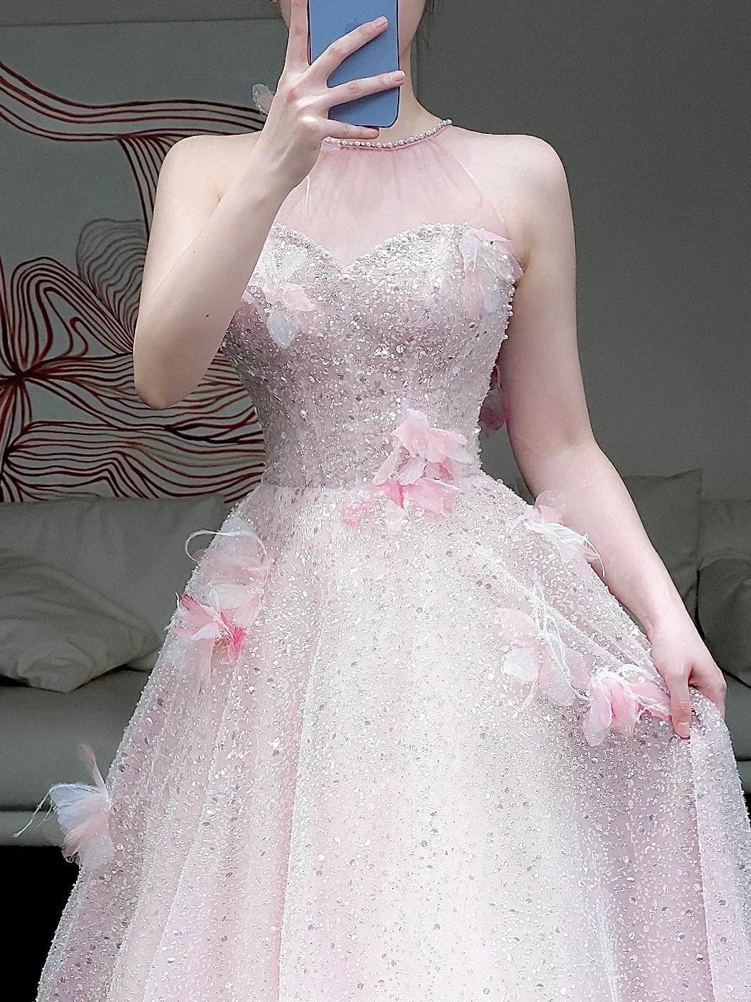 Stunning Ball Gown High Neckline Pink Sequin Long Prom Dress Party Dress Graduation Dresses DP868