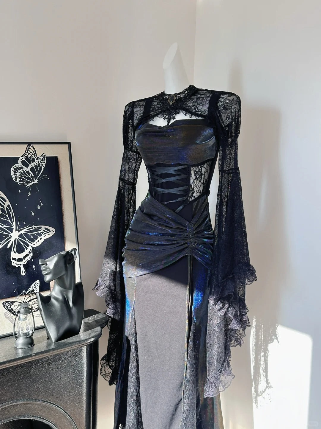 Stunning Black Mermaid Strap Lace Drawstring Prom Dress P3434