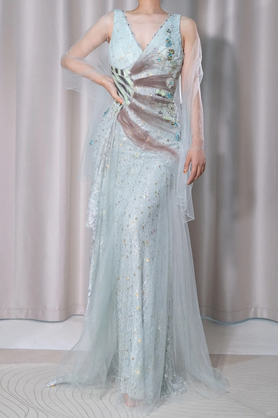 Stunning Light Green V-Neck Tulle A-Line Lace Sequins Prom Dresses Formal Backless Evening Gowns ED02515