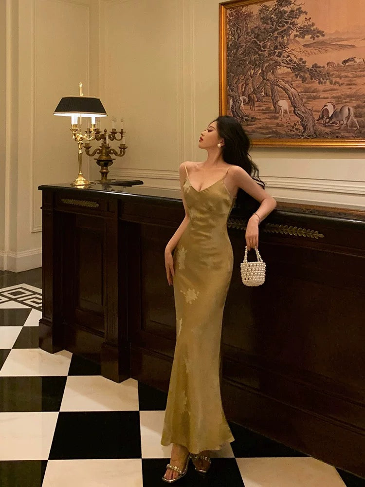 Stunning Mermaid Spaghetti Straps Floral Gold Long Prom Dresses Birthday Outfit SD783
