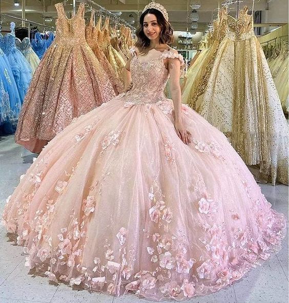 Stunning Off The Shoulder 3D Floral Flower Patterned Ball Gown Quinceanera Dresses V Neck Sweet 16 Pink Prom Dress fg1518