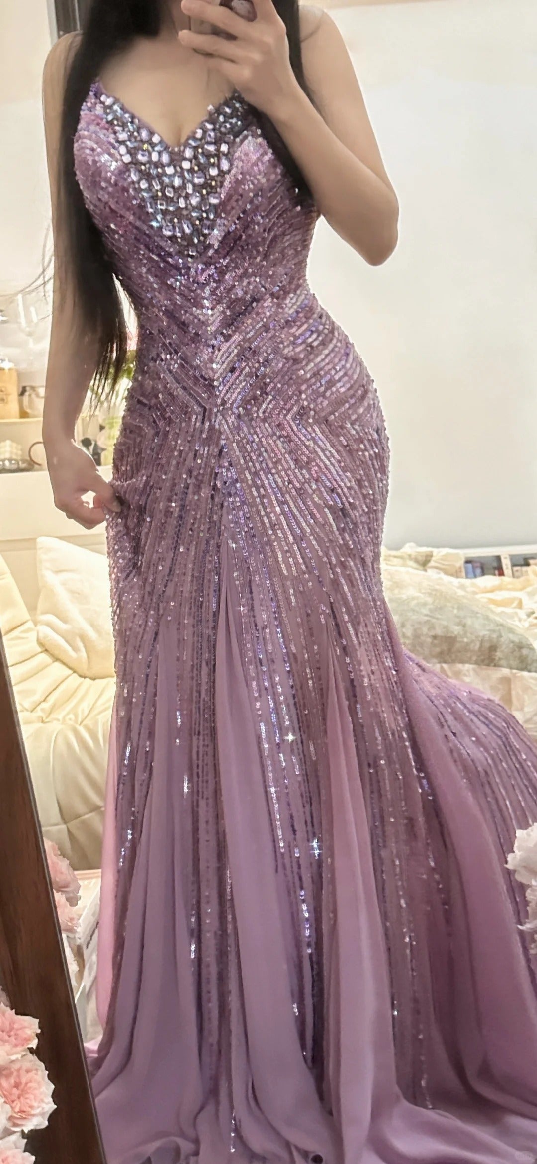 Stunning Purple V-neck Mermaid Beaded Chiffon Long Prom Dresses Vintage Evening Gowns ED02954