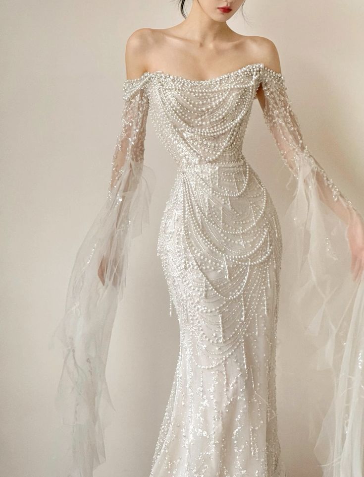 Stunning White Pearl Mermaid Long Sleeve Sequin Tulle Evening Dress Party Dress Wedding Dress SH3475
