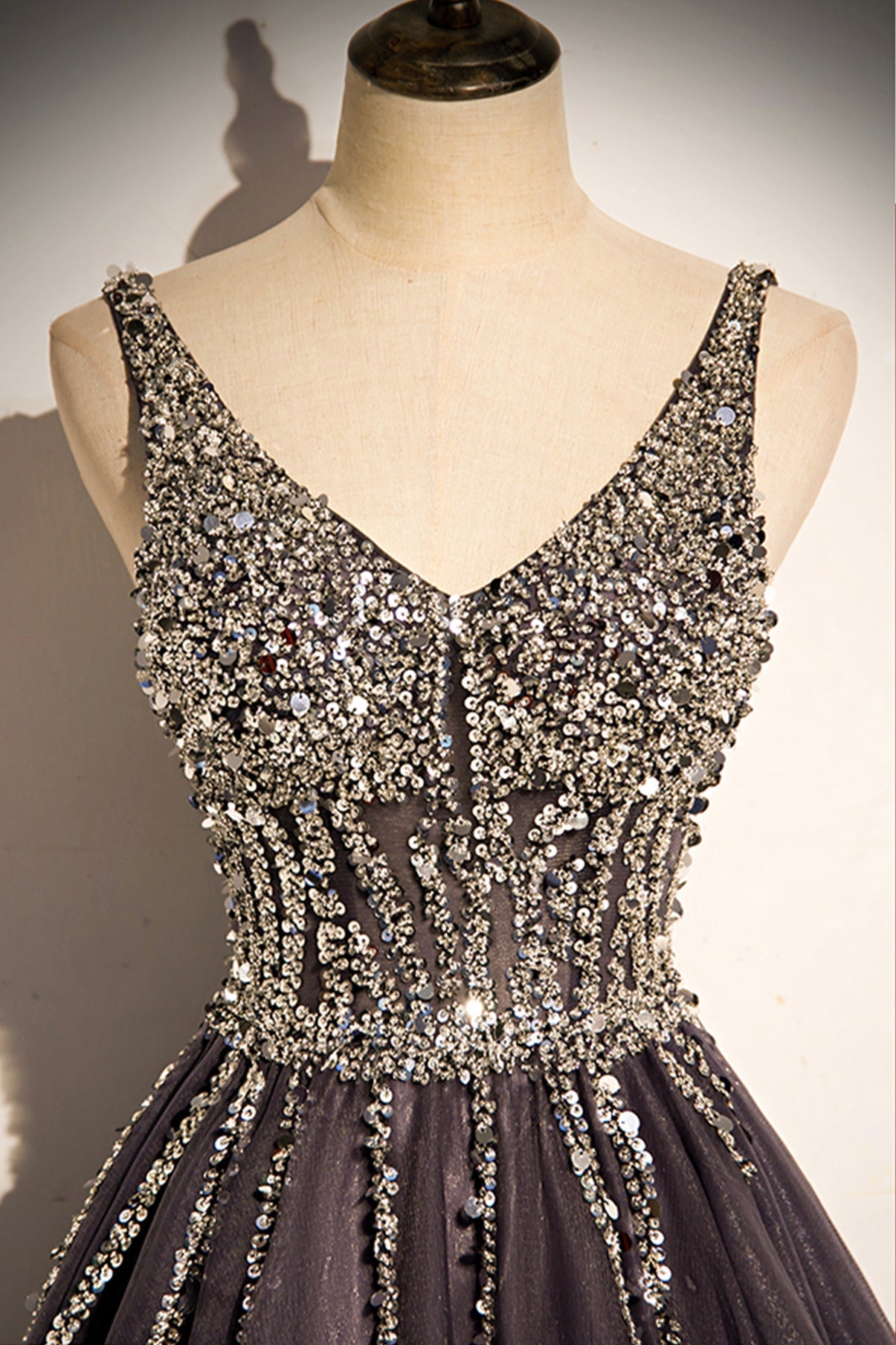 Stylish v neck tulle long prom dress A line evening dress 8640