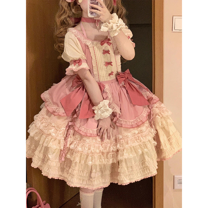 Sweet Ball Gown Square Neck Short Sleeves Gothic Pink Lace 16th Birthday Dress Lolita Dress Birthday Outfits W1118
