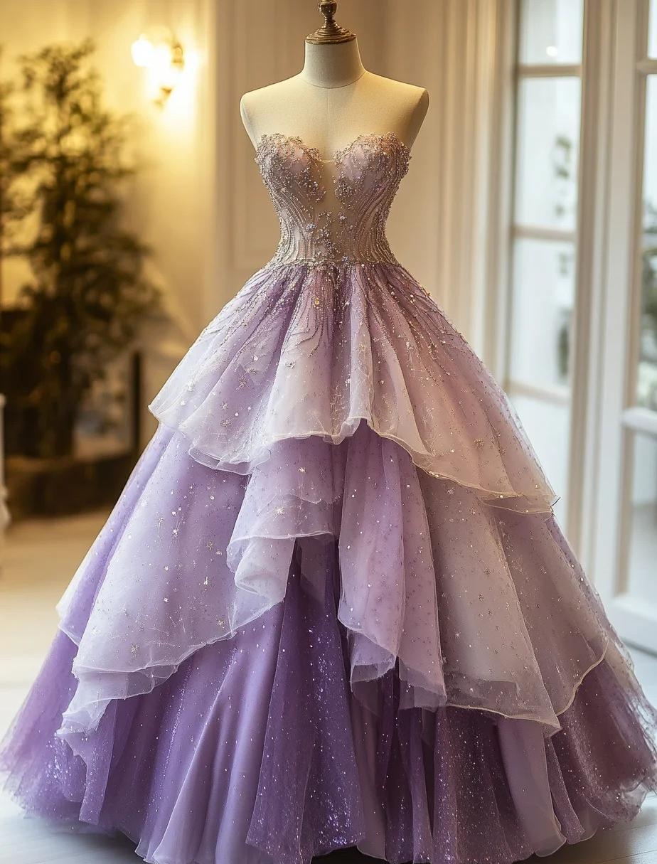 Sweet Gradient Purple Sweetheart Neck Tulle Beaded A-Line Long Prom Dress ED02030