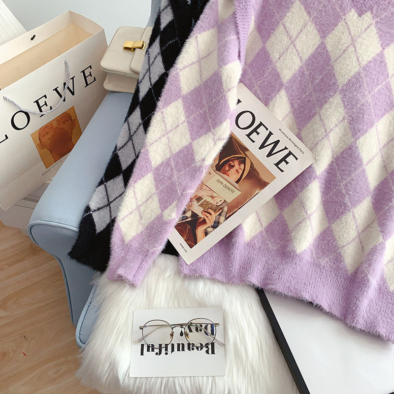 Sweet lazy wind imitation mink velvet checkered sweater 5006