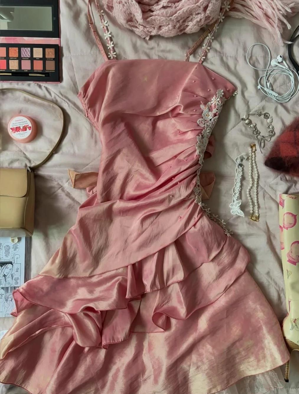 Sweet Vintage Outfits for Party Y2K Spaghetti Straps Sheath Chiffon Satin Short Prom Dresses ED02405