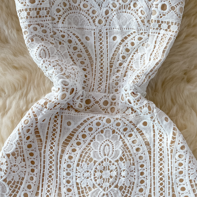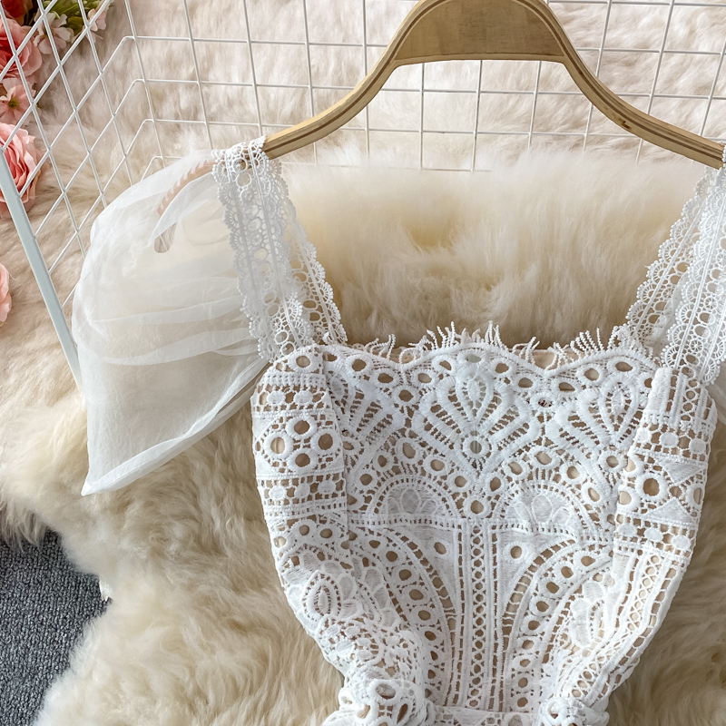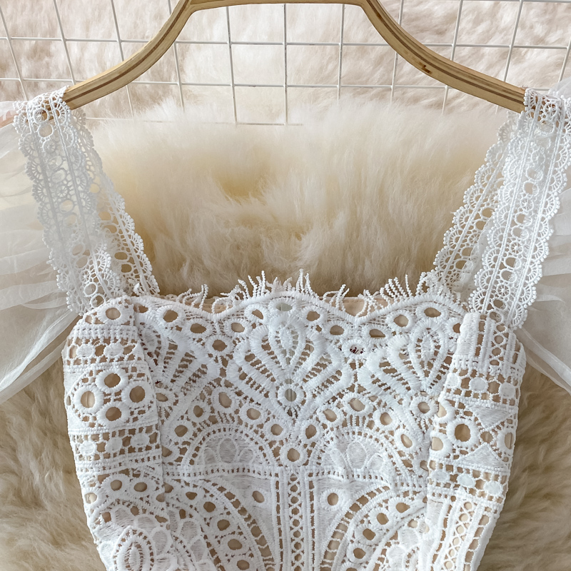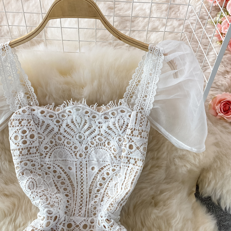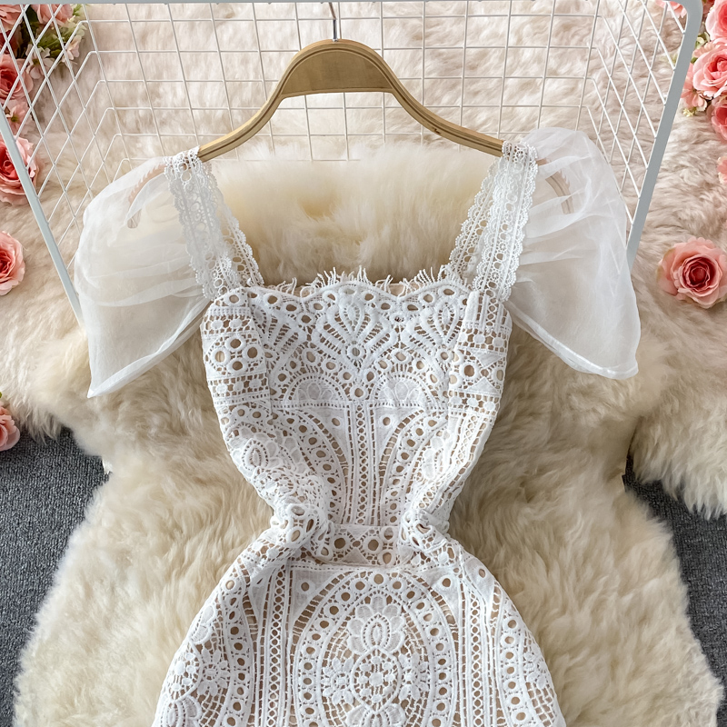 loveedsTM-White Lace Dresses for Women Summer 2024 New Puff Sleeve Square Collar Back Zipper Hollow Out A-Line Evening Midi Dress